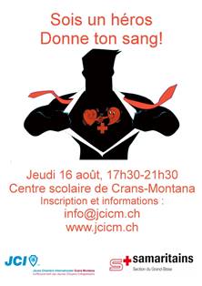 un don de sang le 16 août de 17h30 à 21h30 au centre scolaire de Crans-Montana.